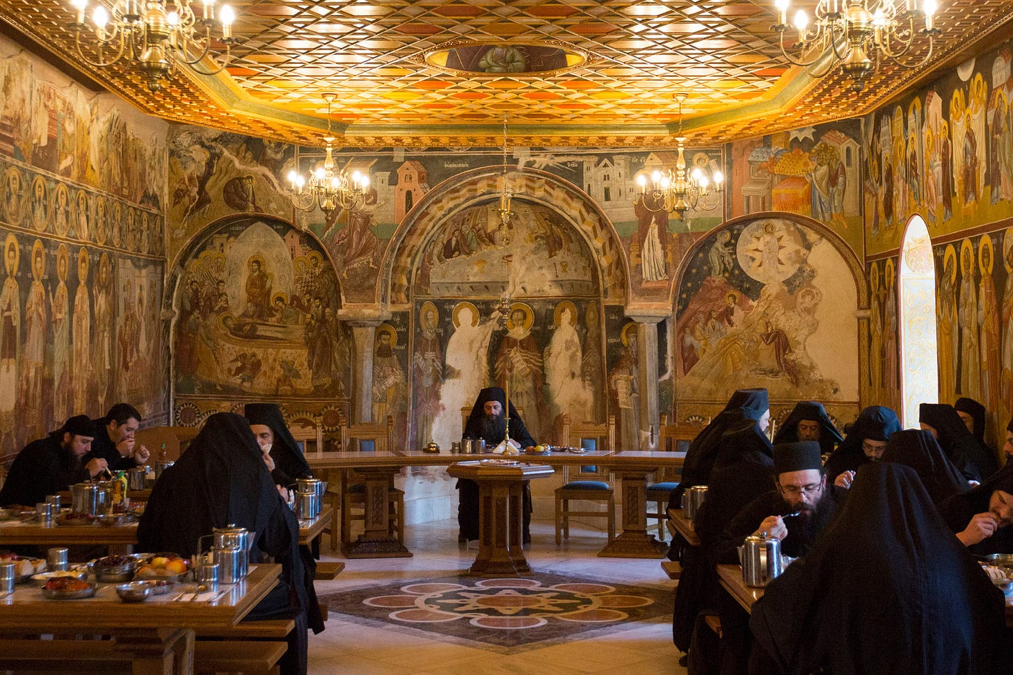 Tras la oración, llega el Refectorio, donde se sirve pan, aceitunas, lentejas y vino diluido. Un lector recita pasajes de los Padres del Desierto o la vida de algún santo.